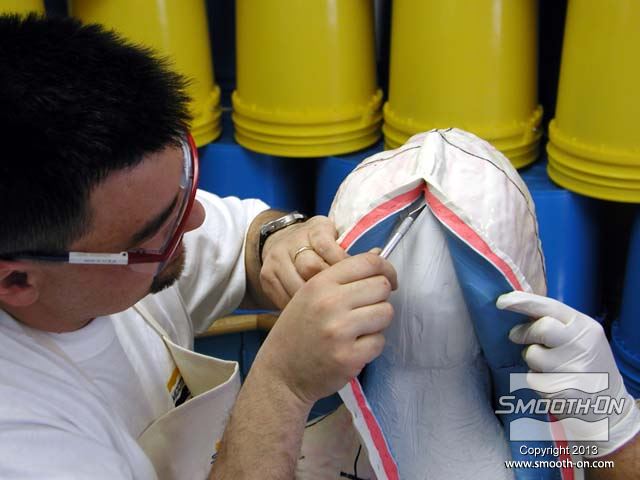 את הפוליאוריטן הסמיך מורחים וסותמים חורים כמו עיניים, אוזניים, או כל מקום אחר שיכול ליצור נעילה מכאנית בין הגיבוי של התבנית לבין הפוליאוריטן.