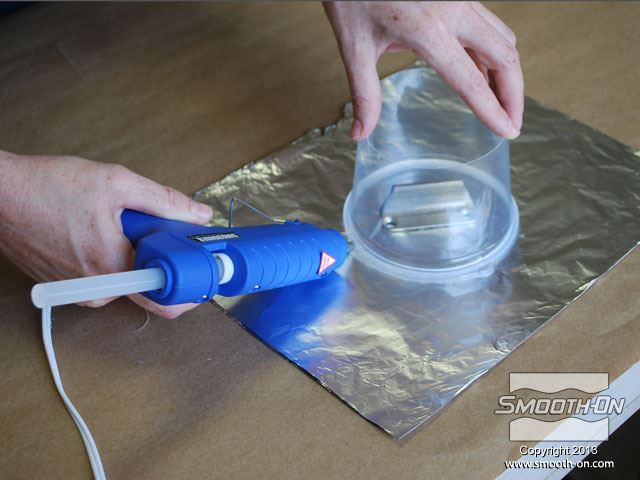 שמים את כוס הפלסטיק מסביב למודל ומדביקים אותה בדבק חם לבסיס. מיכל הפלסטיק צריך להיות במרחק של לפחות 1.5 ס"מ מכל צידי המודל.