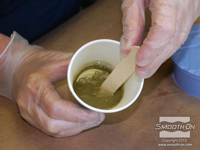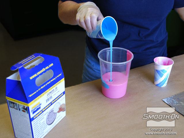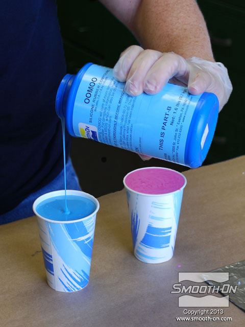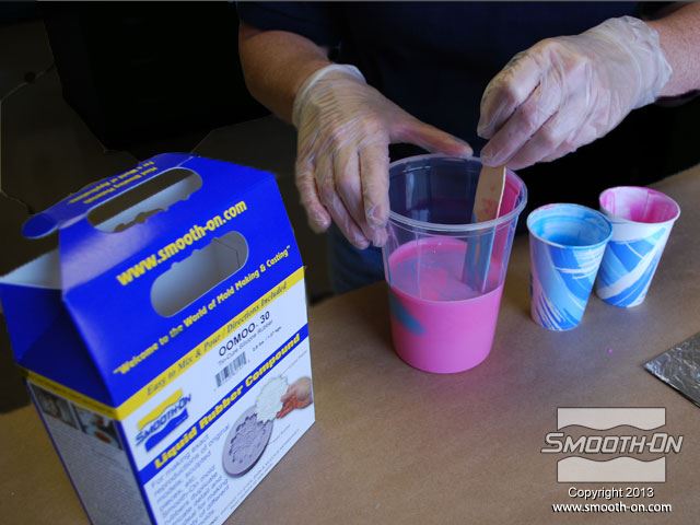 לאחר שהסיליקון Oomoo® 30 הנוזלי בצבע אחיד, מעבירים את הנוזל למיכל ערבוב (נקי) שני.