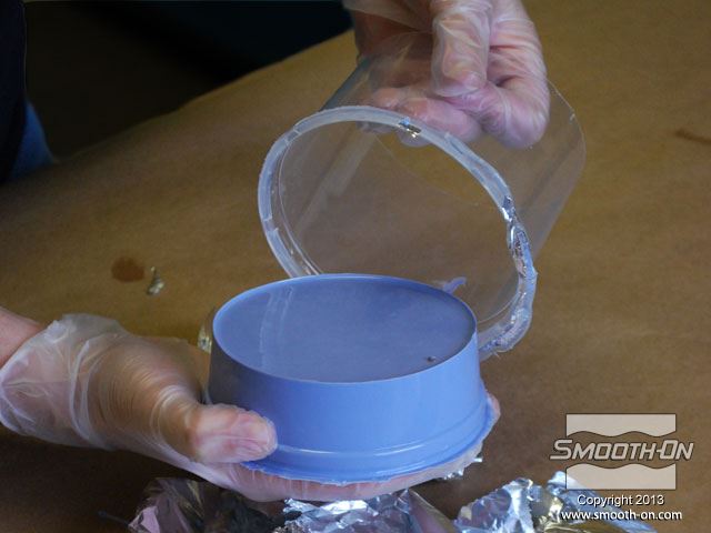 מוציאים בזהירות את תבנית הסיליקון ליציקה Oomoo® 30 ממיכל הפלסטיק.