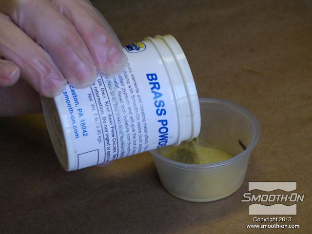 מערבבים ביסודיות את המקשה עם אבקת המתכת ומקפידים לגרד את החומר מתחתית וצידי המיכל.