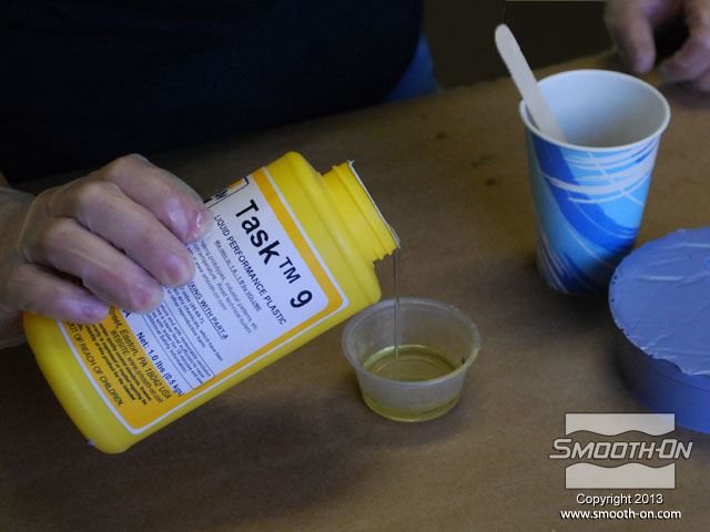 מסמנים קו מדידה על כוס קטנה. כמות קטנה מאוד של פוליאוריתן קשיח Task® 9 תספיק עבור היציקה.