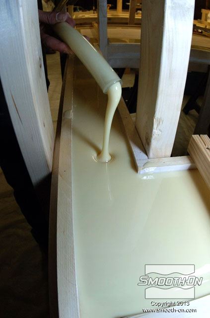 מתחילים ליצוק את הגומי אל מסגרת התבנית. שופכים את הפוליאוריתן VytaFlex 60 לנקודה הנמוכה ביותר בתבנית ומניחים לחומר להתפלס. בשיטה זו החומר דוחף את האוויר החוצה, כך שלא נוצרות בועות.