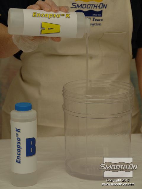 מערבבים כמויות שוות של בסיס ומקשה של סיליקון שקוף ליציקה Encapso® K במיכל ערבוב גדול.