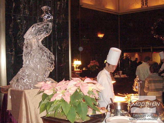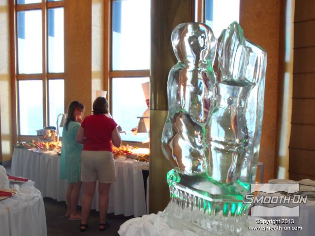פסלי הקרח של ארנסטו על סיפון הQE II. הפסלים מוסיפים מגע אלגנטי למסעדה.