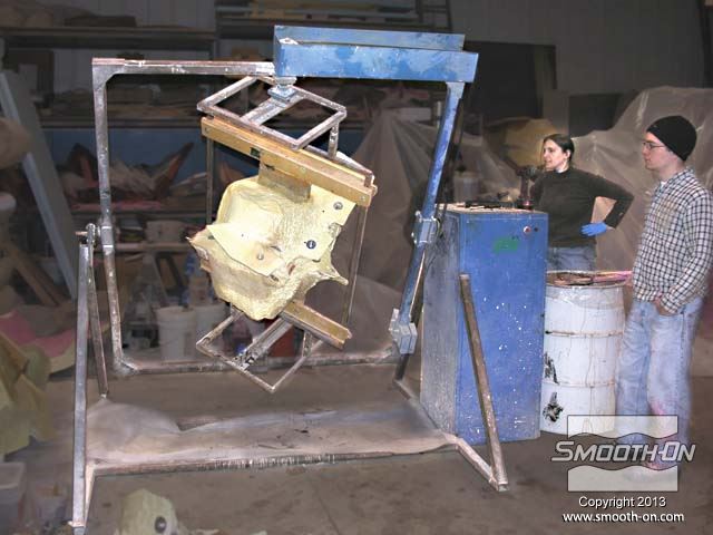 מסדרים את התבנית ביחד עם מעיל התמיכה במכונת יציקה ברוטציה (Rotocasting).