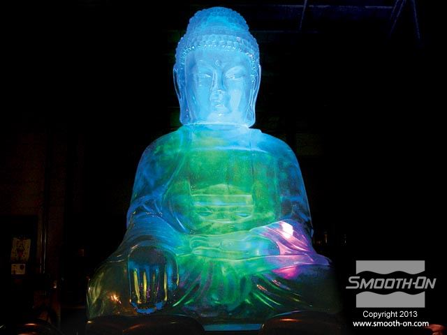יציקות הפוליאוריתן Crystal Clear מורכבות לגמרי. פסל הבודהה יושב על פרח לוטוס שהוכן ביציקת 'מתכת קרה' מפוליאוריתן Smooth-Cast.